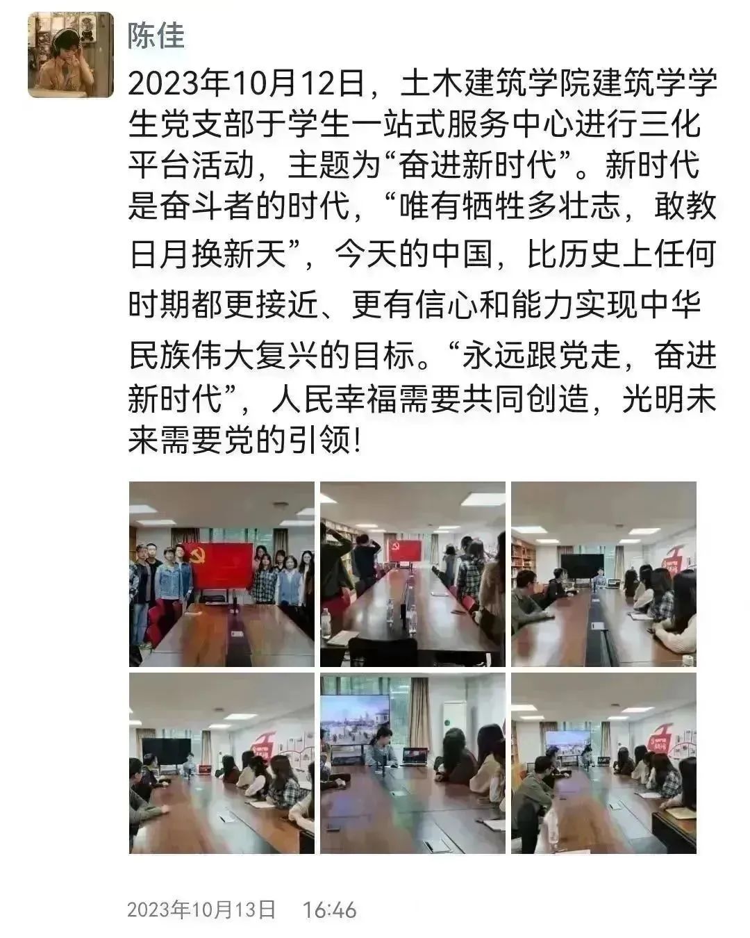 近日,建筑学学生党支部在三化平台开展一次以“奋进新时代”为主题的主题党日活动,活动内容主要有四项: