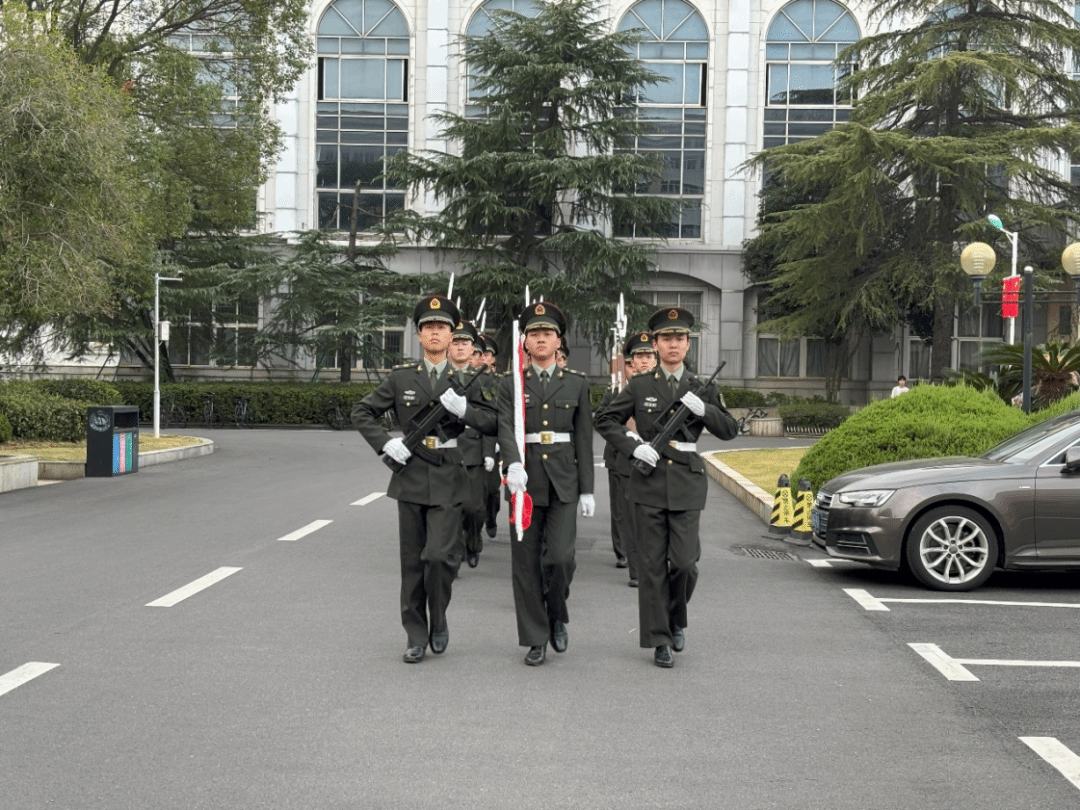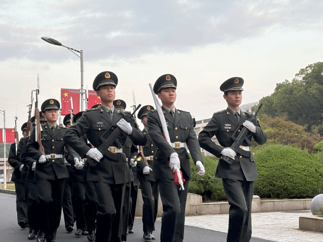 晨曦微露,护卫队的身影愈发挺拔,沿着朝阳下金红色的道路,沉稳而庄严地向升旗台缓缓迈进。对国旗的崇敬与守护镌刻于这黎明的序曲之中。