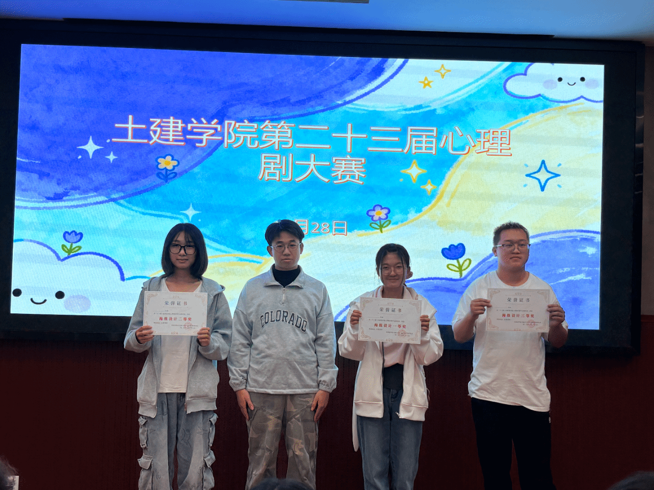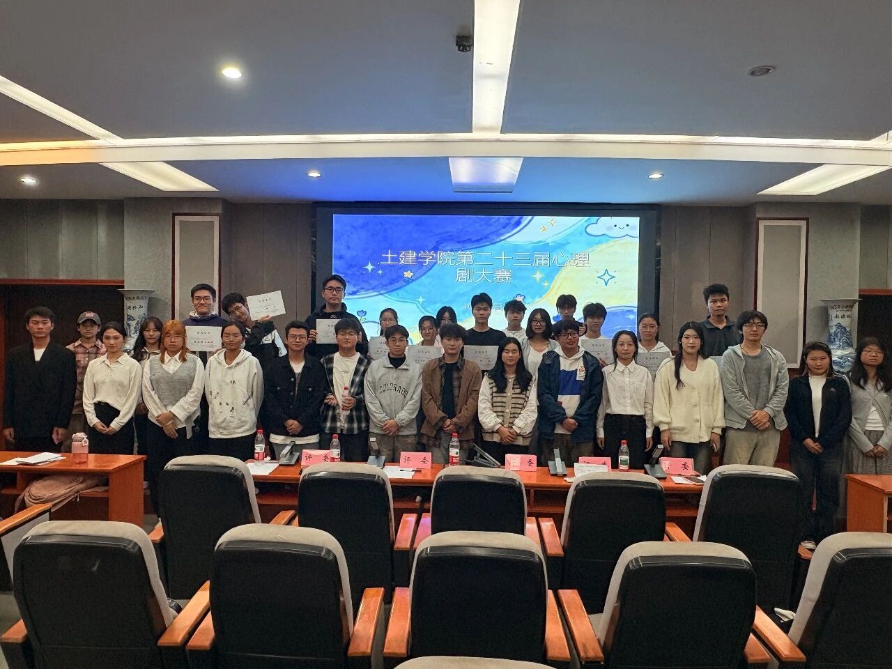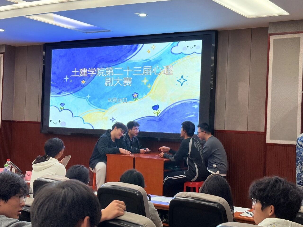 为了帮助大一新生更加了解自己的心理活动和内心世界,提高同学们的交流与合作,陪伴他们健康成长。10月28日晚上7点,土建学院心素会在土建200开展心理情景剧大赛,学院心理辅导员汪晶晶老师,汪满老师,校心联主席王泽梁,研究生学长李云帆,研会主席练文静等出席此次决赛并担当评委。