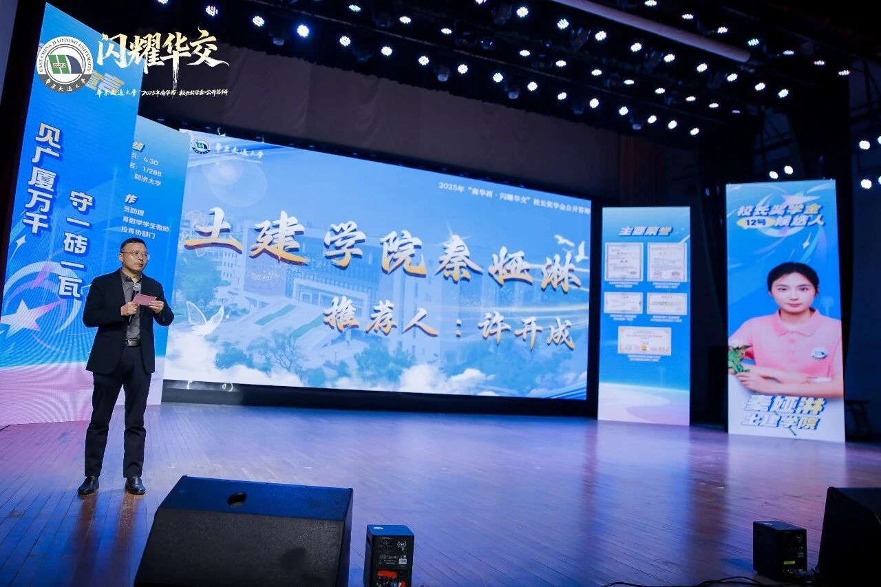 11月27日,太阳集团2025年“南华西•闪耀华交”校长奖学金公开答辩在南区礼堂隆重举行。在这场汇聚全校优秀学子的激烈角逐中,我院学子表现卓越,给排水2022-1班楼佳琪荣获校长奖学金,建工2022-2班秦娅淋荣获校长奖学金提名奖,彰显了土木学子笃实精进、追求卓越的青春风采。