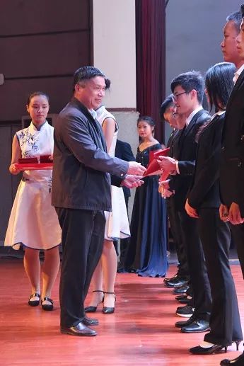 校党委书记万明为在第35届校运会中做出突出贡献的运动员上台领奖,他们分别是徐幸、马虎。徐幸获得学校学院赠予的一本珍贵纪念册,马虎获得一双金金战靴,继续驰骋赛场,扬帆远航。