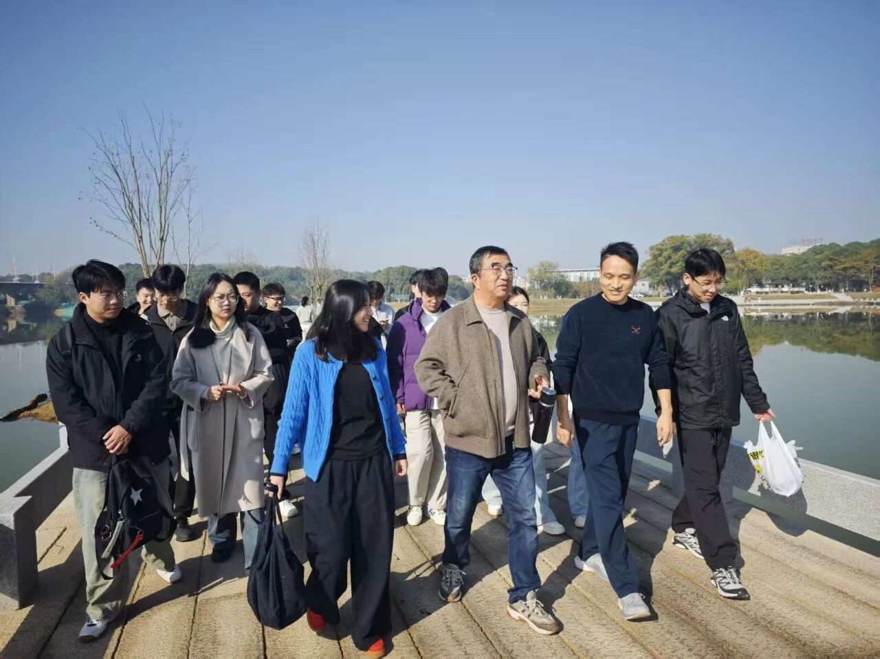 上午十时,南区孔目湖公园内,退休老教师鲁秀国教授与青年学子围湖漫步,畅谈红色记忆与青春担当。鲁教授以红色经典为引,讲述了老一辈革命者在艰苦环境中坚守信念、砥砺前行的故事。他叮嘱学子们,要从红色文化中汲取精神力量,把革命先辈的奋斗精神融入学习科研中,沉心钻研、精益求精。谈及青年担当,鲁教授强调:“政治上要积极向党组织靠拢,坚定理想信念;专业学习要全力攻克,各类有益活动要主动参与,让校园生活既充实又有意义。”他还特别提醒大家,身体是革命的本钱,要坚持锻炼,将个人成长与学校发展、国家建设紧密相连。