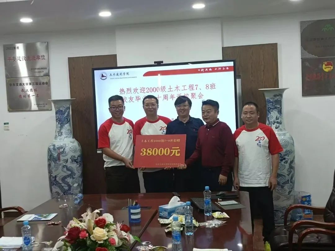 2000级土木7、8班于学校50年校庆之时共捐赠38000元,表达了对我校我院的赤诚之心,学院借2000级土木7、8班本次毕业20年聚会的良机,为此补办了捐赠仪式。