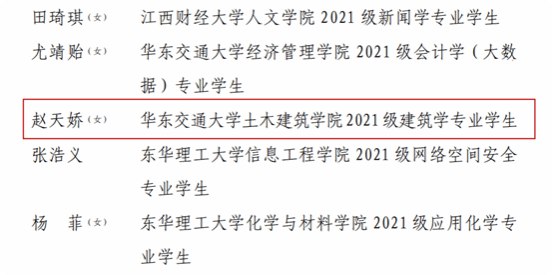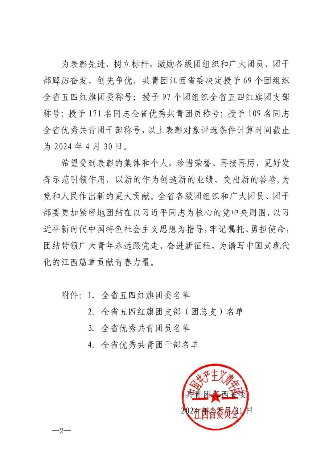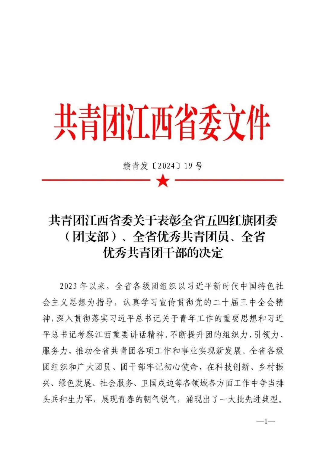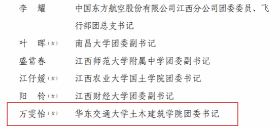 近日,共青团江西省委正式发布了《赣青发〔2024〕19号关于表彰全省五四红旗团委(团支部)、全省优秀共青团员、全省优秀共青团干部的决定》,我院团委书记万雯怡老师获评“全省优秀共青团干部”,2021级建筑学专业赵天娇同学获评“全省优秀共青团员”。