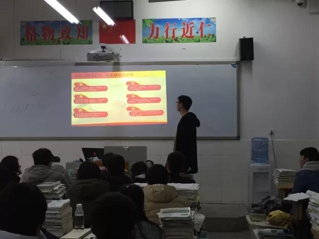 2018年2月28日,在重庆市黔江区民族中学校,土建学院学生二支部李浩向2018级22班开展了”“花椒”学子返乡宣讲十九大精神”宣讲会。会议的主题为:新时代,新思想,新征程。