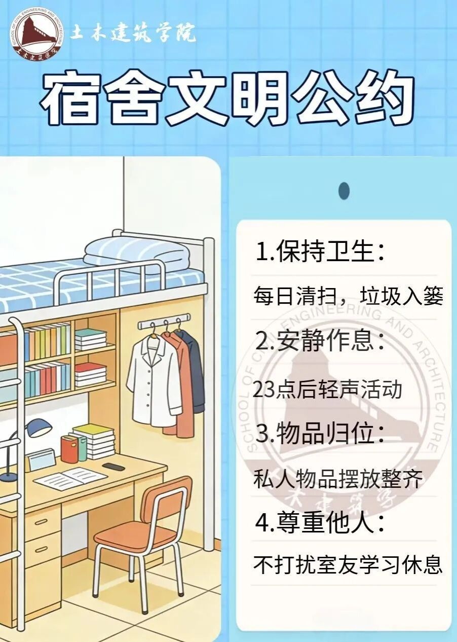 从公约上墙到自觉践行,从主题班会到全员清扫,从专项督导到趣味互动,土建学院2026年宿舍文明建设月七大行动开展有序、成效显著。文明之风、安全之风、和谐之风正浸润着每一间寝室,融入每一位学子的日常生活。