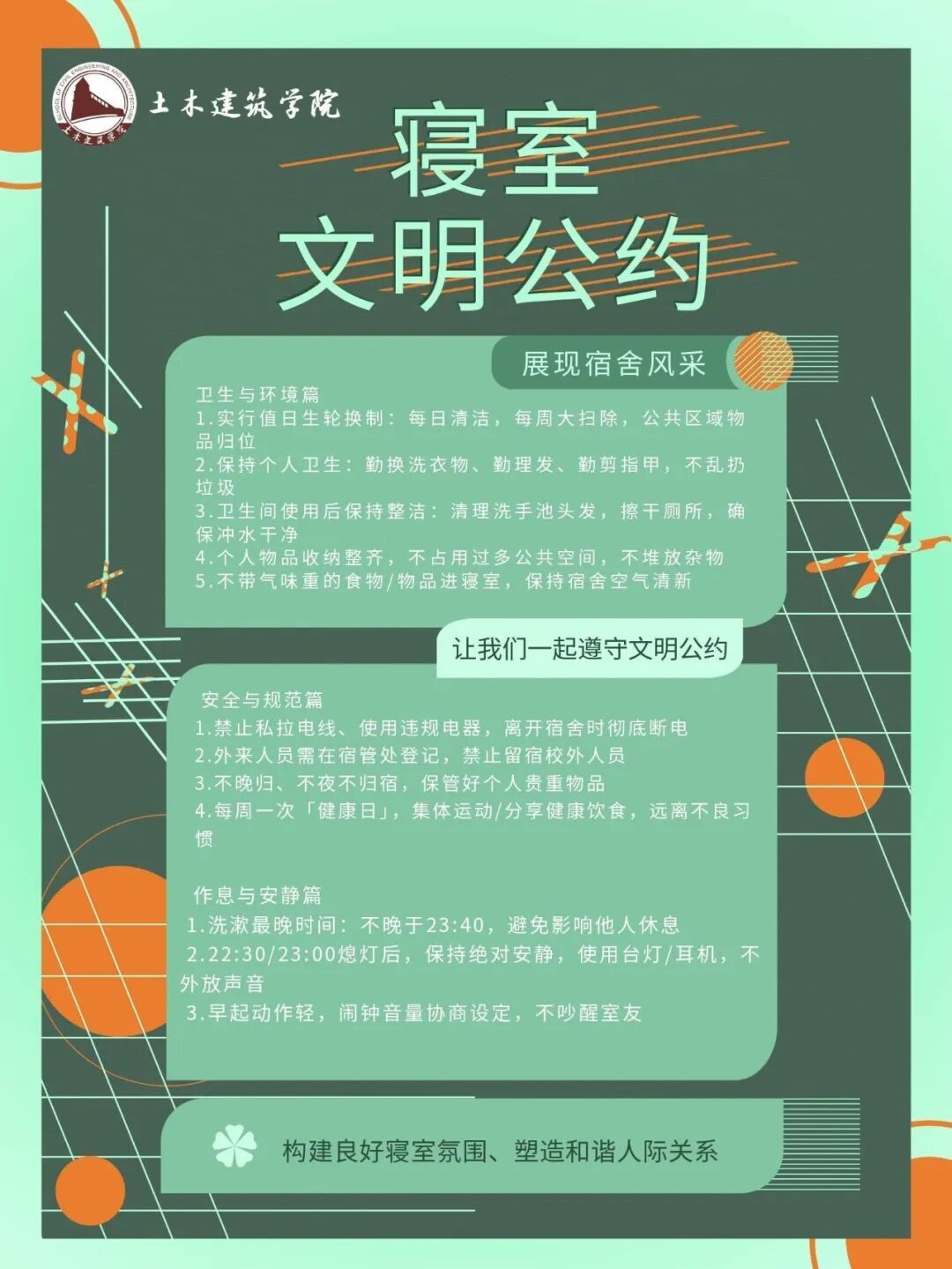 目前,建设月各项活动仍在火热推进中。下一步,学院将持续深化宿舍文明建设内涵,健全长效管理机制,选树文明寝室标杆,强化日常督查与学风引导,让安全、整洁、文明、和谐成为土建宿舍的最美底色。让每一位同学都能在这一方温馨小家里,遇见最好的室友,成就最好的自己!