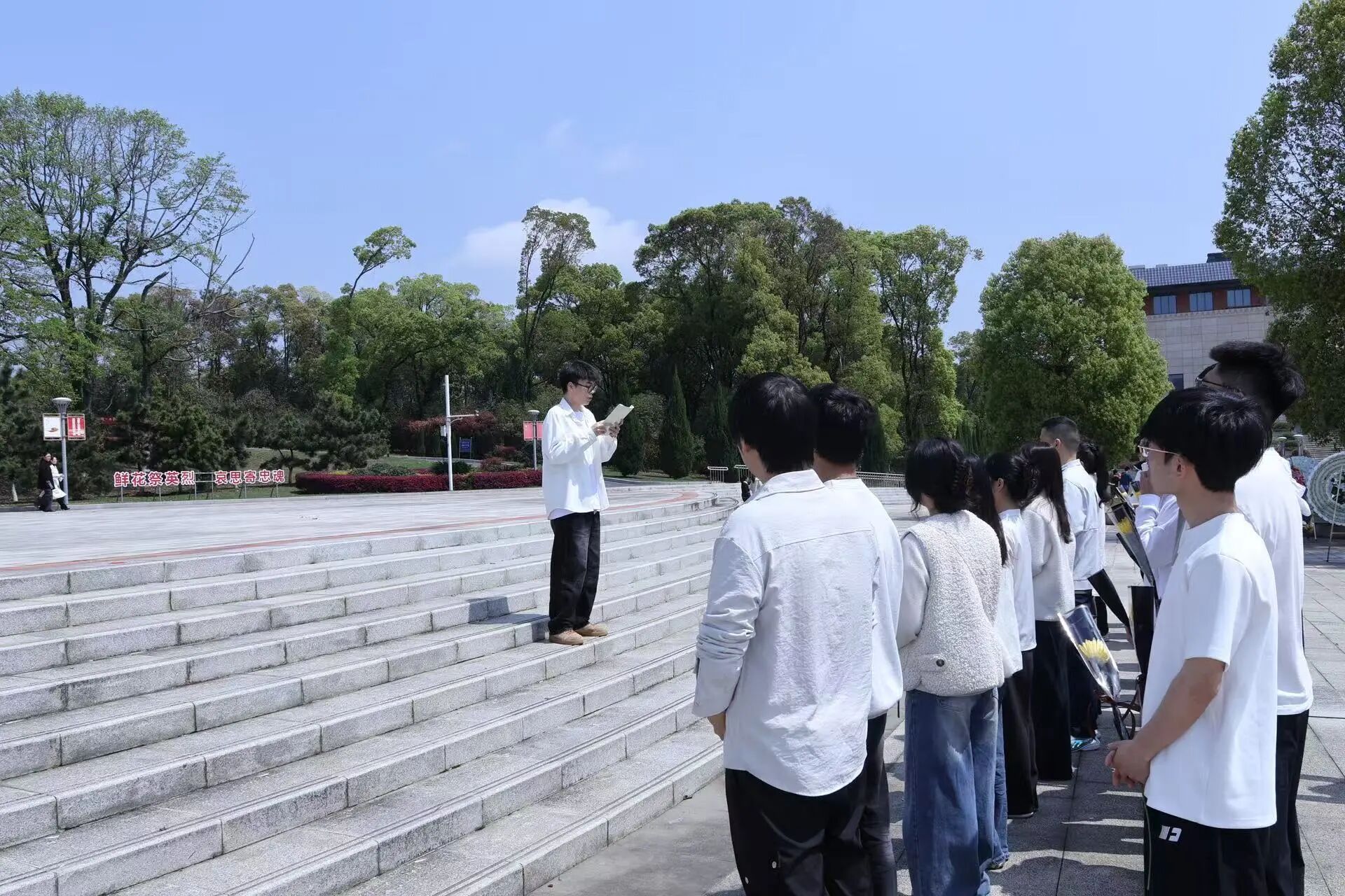 默哀毕,敬献鲜花环节正式开始。学子们手持菊花,依次缓步上前,将鲜花轻轻放置于烈士墓碑前,驻足弯腰致意。